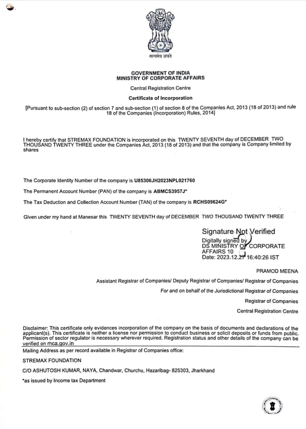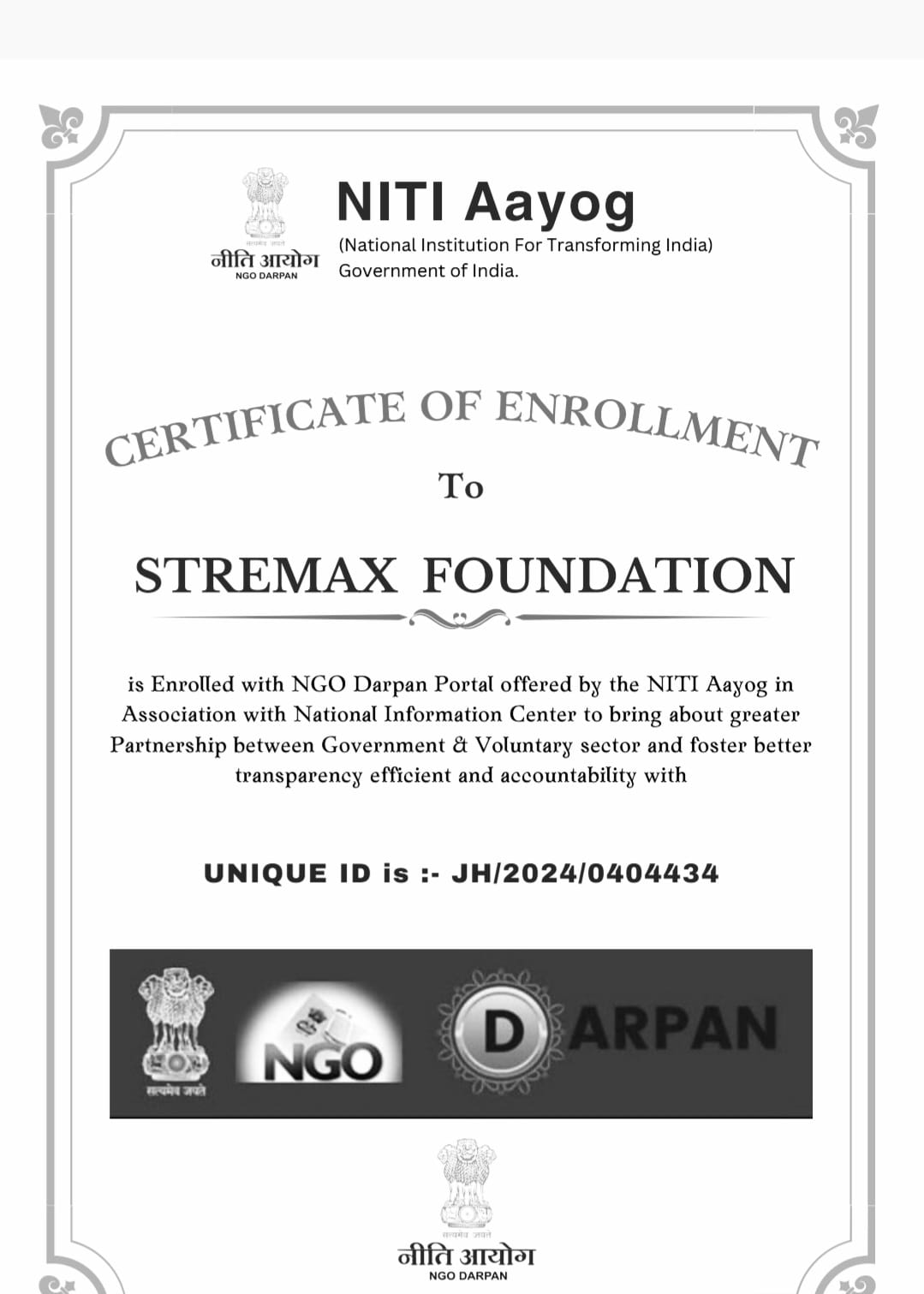 Stremax Foundation is a Non-governmental Organization (NGO). Registered under Section 8 – Company Ministry of Corporate Affairs Govt. of India & Niti Aayog. The Stremax Foundation was established on 27 December 2023 by two friends Mr. Pintu Kumar and Mr. Bipin Kumar.